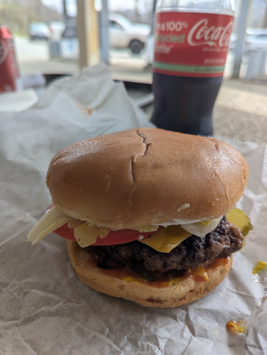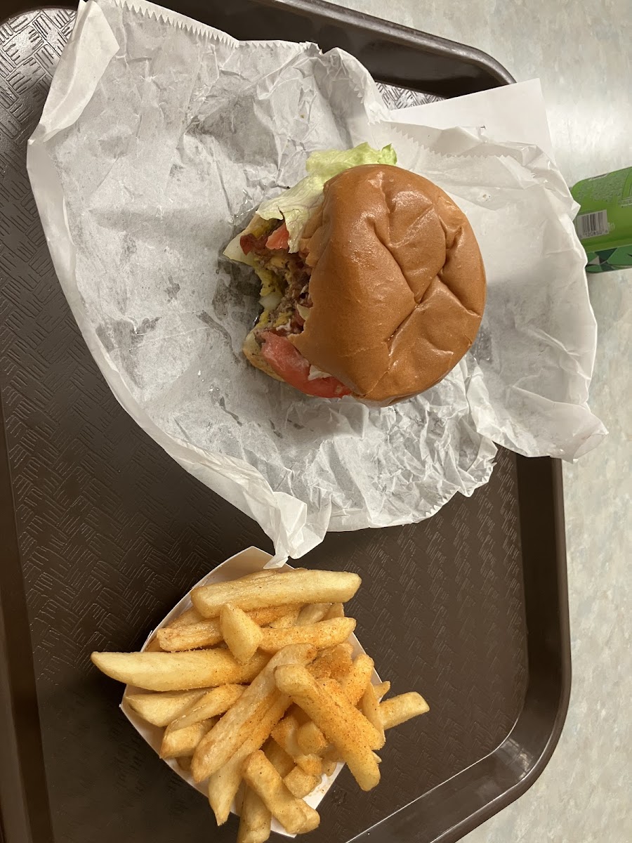 Very good burger & fries. Had everything that we needed, appreciate that they sell sweet tea by the gallon!!! When grabbing lunch after working on cleaning/ / repairing someones house, wasn't looking for or expecting "atmosphere"...
